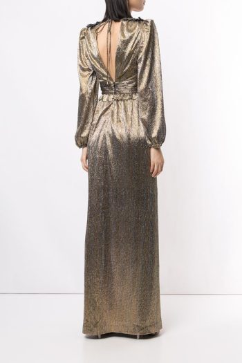 RRP: €720.00| Rent From €135.00Metallic Gold gown Accentuated waist Ruffled trims on shoulders V-neck Elasticated cuffs Front slit Ties at back Fully lined Stretchy fabric but tight at waist Lightweight fabric