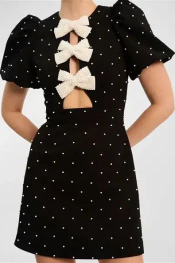RRP: €745.00| Rent From €150.00Pearl Embellished Rounded Neckline Voluminous Puff Sleeves Fitted Bodice with Front Cut Outs Pearl Bow Detail Cinched Waist A-Line Mini Skirt Zip Fastening at Back Dress is Lined
