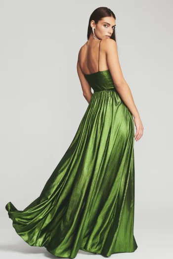 Brown metallic-bronze side slit Long length spaghetti straps Sleeveless Structured cupped bra Flowing hem